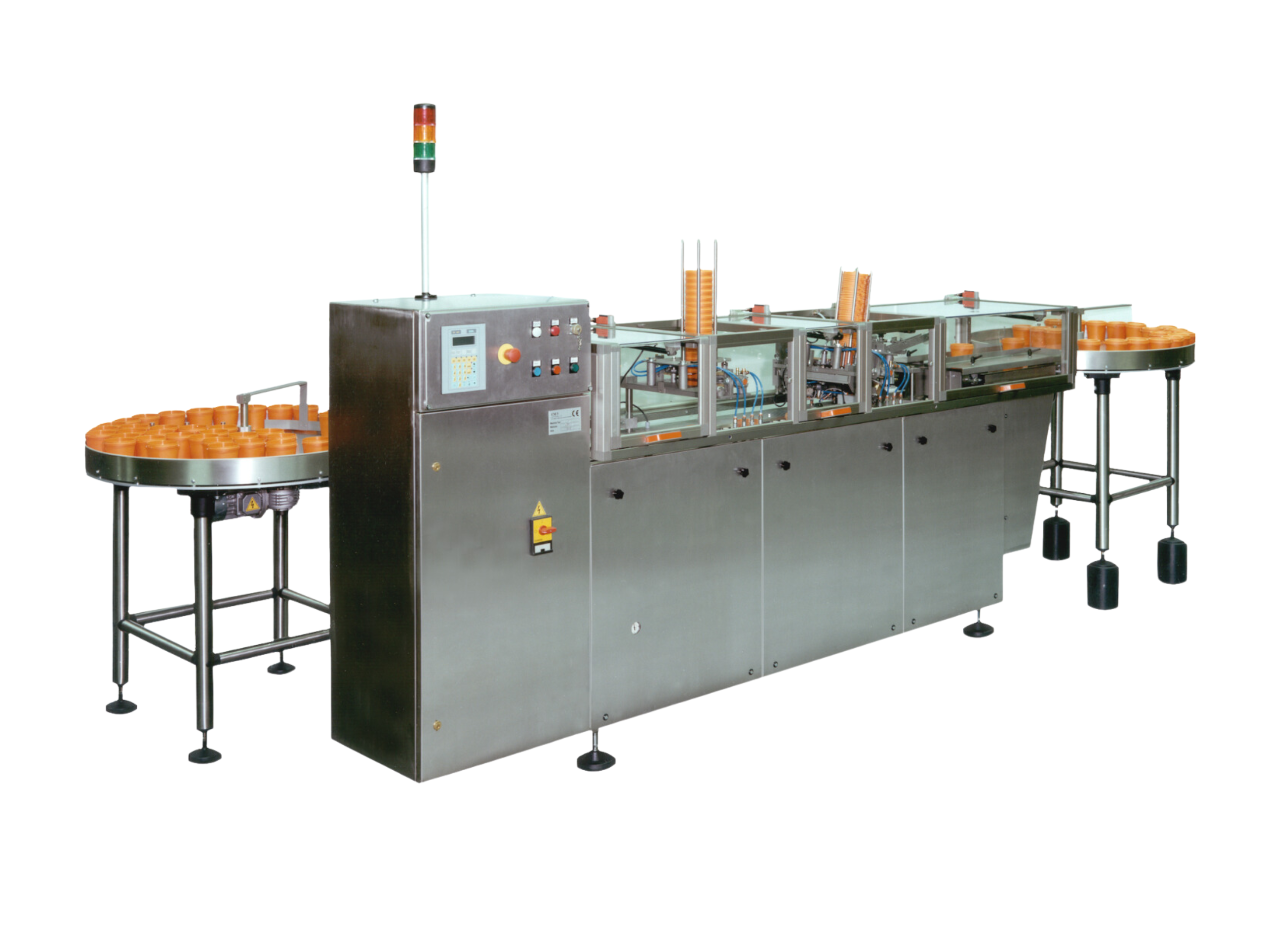 La Macchina “V” ha lo scopo di rendere automatico il confezionamento di contenitori troncoconici e cilindrici in PP provenienti da magazzino tavolo rotante preventivamente alimentato, successivamente al riempimento di prodotto, i contenitori vengono tappati.